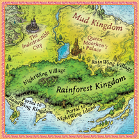 The Rainforest Kingdom is the home of the RainWings and most of the NightWings. It is ruled by Queen Glory.[1] It is located in southern Pyrrhia in an area that resembles the "underbelly" or "hind" of the continent. The kingdom is described to have tall trees, exuberant flowers and to be a muddy quagmire.[4][5] The Mud Kingdom borders it to the north and the Sky Kingdom borders it to the west.